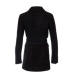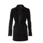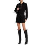 The Dodo Bar OR Marina Mini Dress’ is crafted from black suede, featuring a long-sleeved silhouette with an elasticated lace closure in the front. It includes a tonal belt that cinches the waist and ties at the front, along with flap pockets.