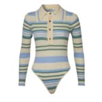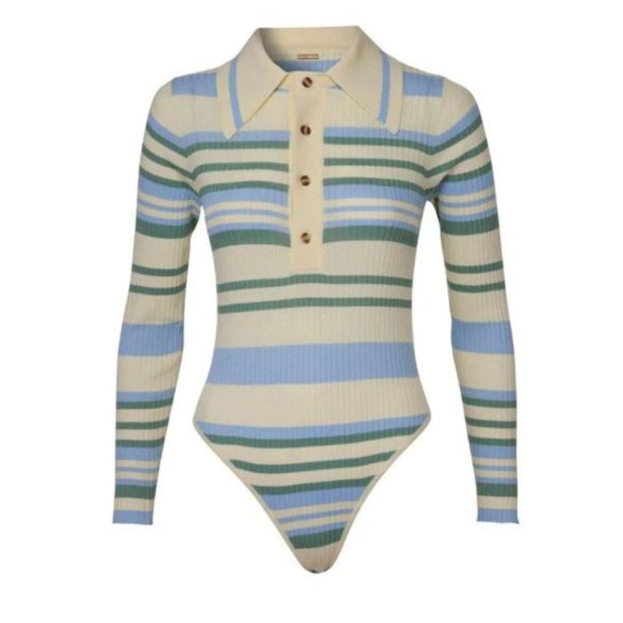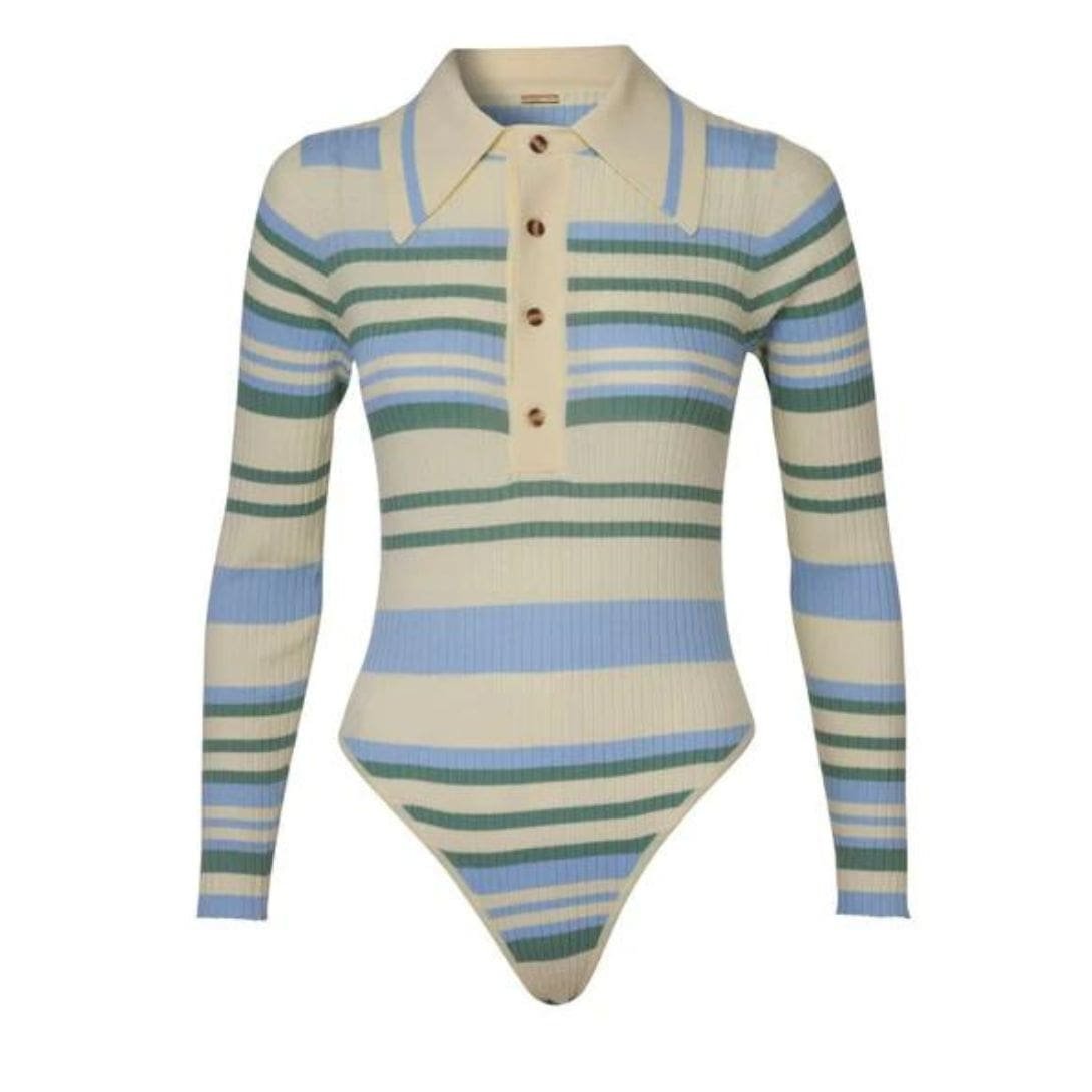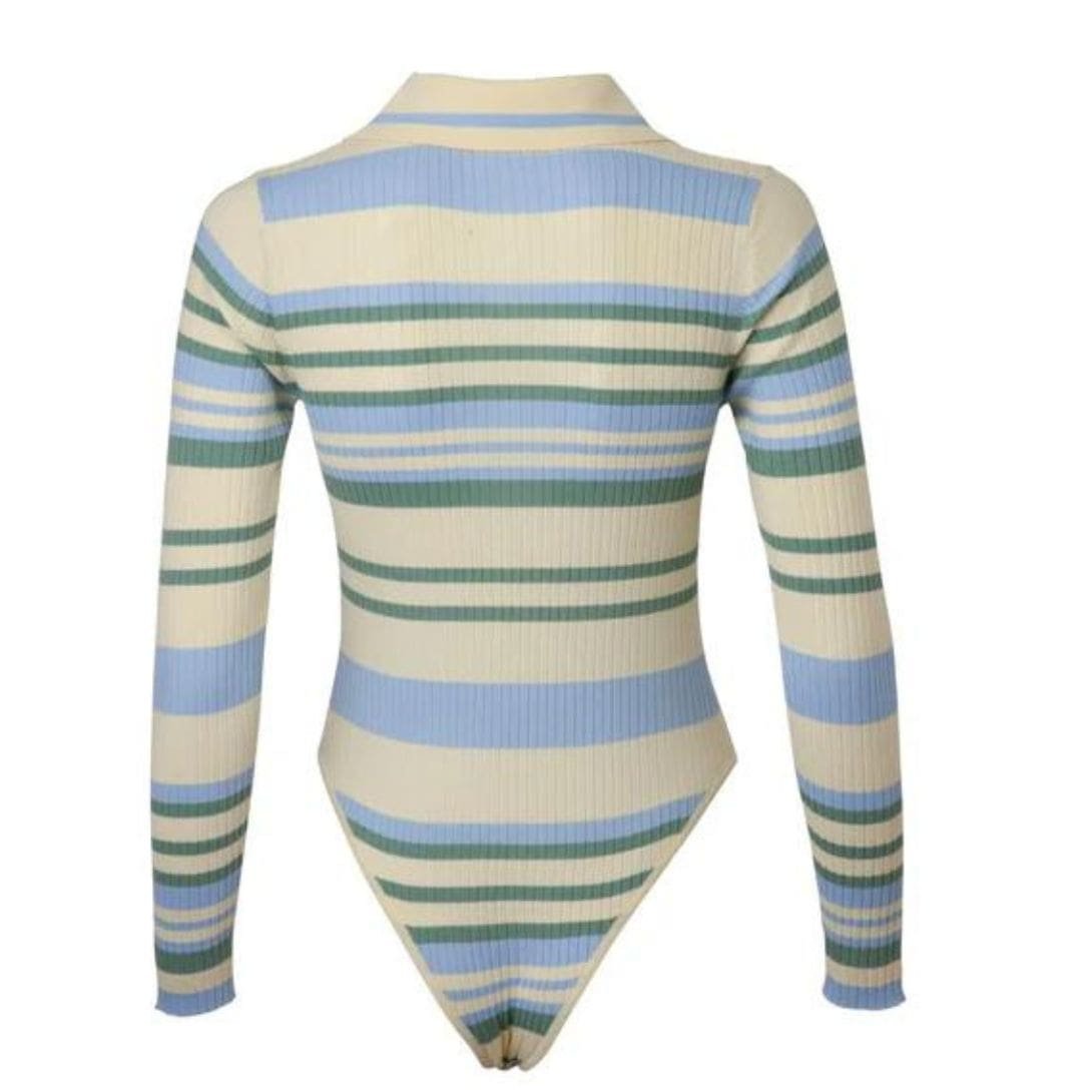 The doDO BAR OR Penny Bodysuit is designed for a tight fit and features knitted stripes, an accentuated collar, and a buttoning top.