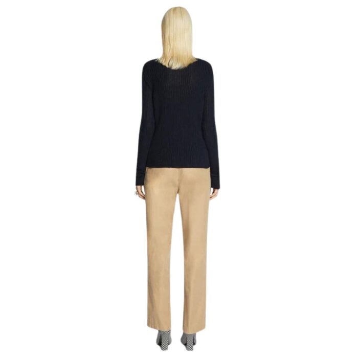 The Dries Van Noten Ribbed Sweater features a contrast collar that adds a distinctive touch to the classic crew neck design. This detail elevates the sweater’s aesthetic appeal and offers a refined look suitable for both casual and semi-formal settings.