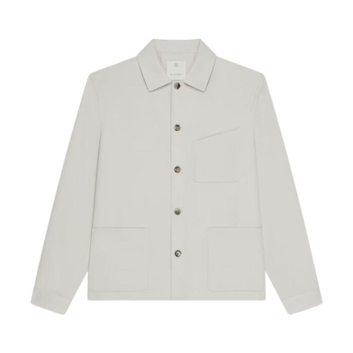 The overshirt features a classic collar and button-down front, allowing for versatile styling options. It can be worn as a standalone piece or layered over a turtleneck or tee for a more relaxed look. The sleek design is complemented by the attention to detail that Givenchy is renowned for, including perfectly aligned seams and finely crafted buttons that add a touch of sophistication.