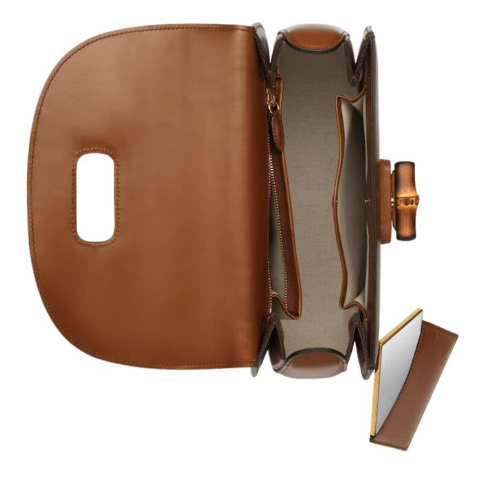 The bag’s hardware is subtly branded, with the iconic Gucci GG logo subtly embossed on the leather, adding a touch of luxury without overpowering the bag’s classic design. The closure is secured with a flap and a sophisticated bamboo clasp, a nod to the bag’s heritage and craftsmanship. GUCCI BAMBOO 1947 MEDIUM TOP HANDLE BAG