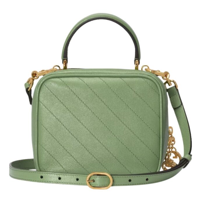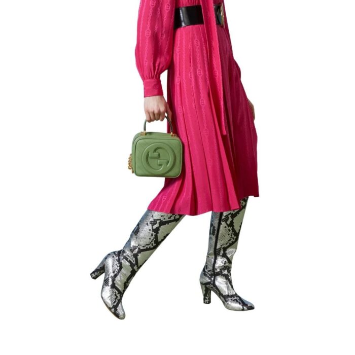The front of the bag is adorned with the iconic interlocking GG logo, a symbol of Gucci’s storied legacy and commitment to exquisite craftsmanship. This emblem is beautifully set against the bag’s smooth leather surface, creating a harmonious contrast that catches the eye. The bag is available in a variety of colors, from classic black and white to bold hues like red and green, catering to different tastes and styles. GUCCI BLONDIE TOP HANDLE BAG