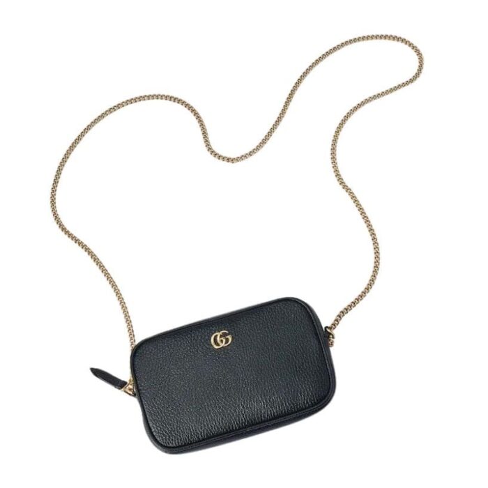 A defining feature of the GG Marmont Super Mini is the antique gold-toned hardware, particularly the iconic GG logo on the front flap. This emblematic detail is a nod to Gucci’s rich heritage and adds a touch of vintage glamour to the design. The chain shoulder strap, also in antique gold, complements the hardware and allows for versatile styling options. It can be worn as a crossbody, over the shoulder, or even used as a clutch by tucking the chain inside.