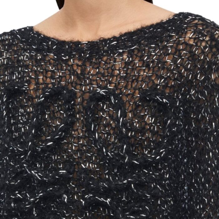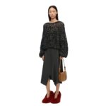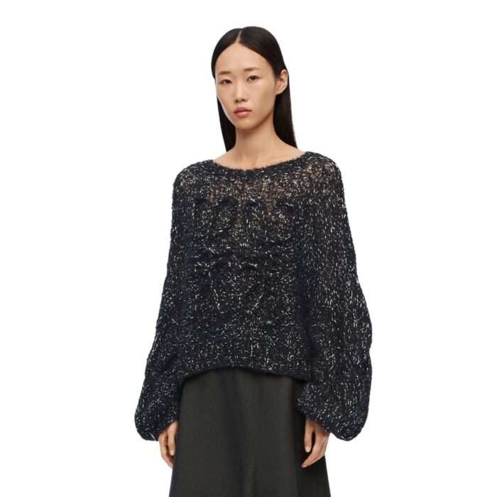 Loewe Anagram Sweater In Mohair Blend is a sophisticated blend of mohair, polyamide, and metal fiber, offering a unique combination of luxury, durability, and innovation. Mohair, derived from the Angora goat, is renowned for its silky texture and natural sheen, bringing a touch of elegance and softness to the material. Polyamide, a synthetic fiber, contributes strength and resilience, ensuring the fabric withstands wear and tear while maintaining its shape and flexibility over time.