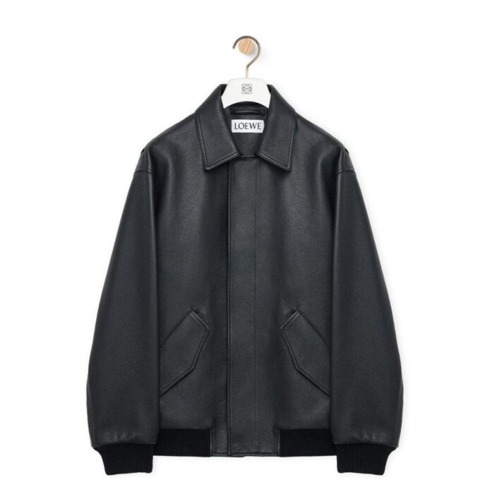 Loewe’s design for this bomber jacket blends classic elements with contemporary flair. The jacket features a sleek silhouette that maintains the traditional bomber shape while introducing subtle, modern updates. The nappa calfskin leather is treated to achieve a smooth, glossy finish that catches the light beautifully, enhancing the overall elegance of the piece. Additionally, the bomber jacket is lined with a soft fabric that provides added comfort and warmth, perfect for layering in various seasons.