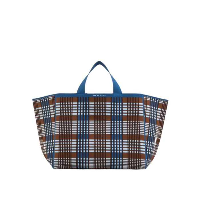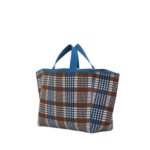 The color palette of blue and brown lends an air of understated elegance, making this shopper a versatile addition to any wardrobe. It pairs effortlessly with both casual and formal outfits, adding a touch of sophistication to any ensemble. Whether used as a statement piece or a practical accessory, the Marni Blue and Brown Jacquard Check Sillo Medium Shopper embodies both style and function, making it a must-have for those who appreciate high-quality craftsmanship and refined design.