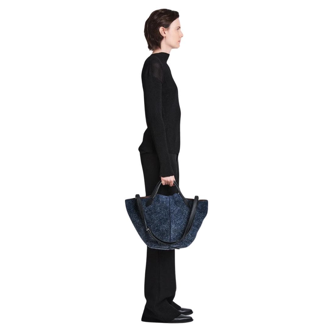 Adding a touch of designer flair, the Proenza Schouler logo is discreetly printed on the front of the tote, showcasing the brand’s signature aesthetic and attention to detail. This subtle yet recognizable detail adds a touch of sophistication to the ensemble, elevating its overall appeal.